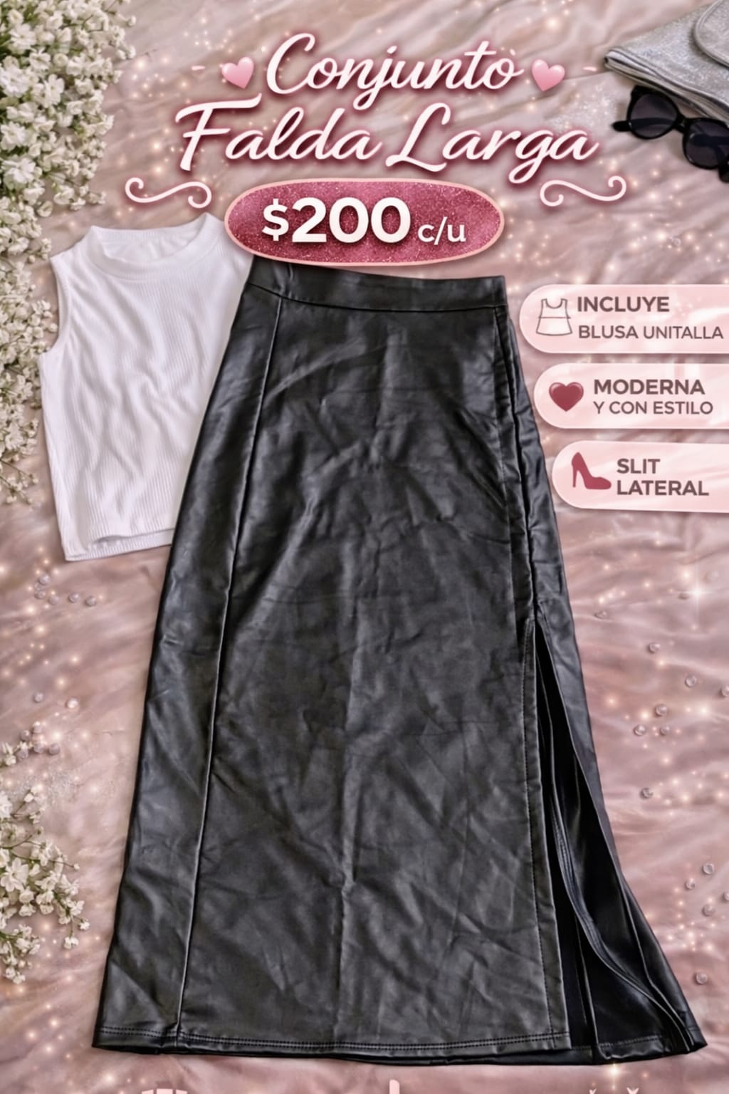 Incluye blusa + falda larga con slit lateral que estiliza la figura y le da un toque moderno y sexy sin exagerar.